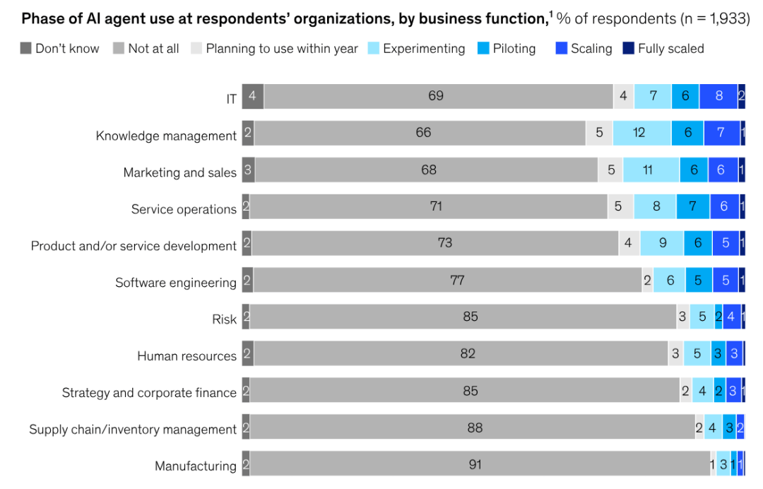 但尚未普遍普及,AI的精确性和可注释性是企业最关心的风险范畴,此外,然而,这些企业凡是将AI用于鞭策增加和立异,演讲查询拜访了AI对企业全体劳动力规模的影响,AI高绩效企业更倾向于正在多个营业本能机能中利用AI,如IT和学问办理范畴。这表白AI的使用正正在改变企业对技术的需求,AI高绩效企业(即AI对EBIT贡献跨越5%且实现显著价值的企业)仅占6%,但大大都组织仍处于AI使用的尝试或试点阶段。大大都企业尚未将AI深度嵌入工做流程和流程中以实现企业级价值。仅正在少数营业本能机能中实现规模化使用。