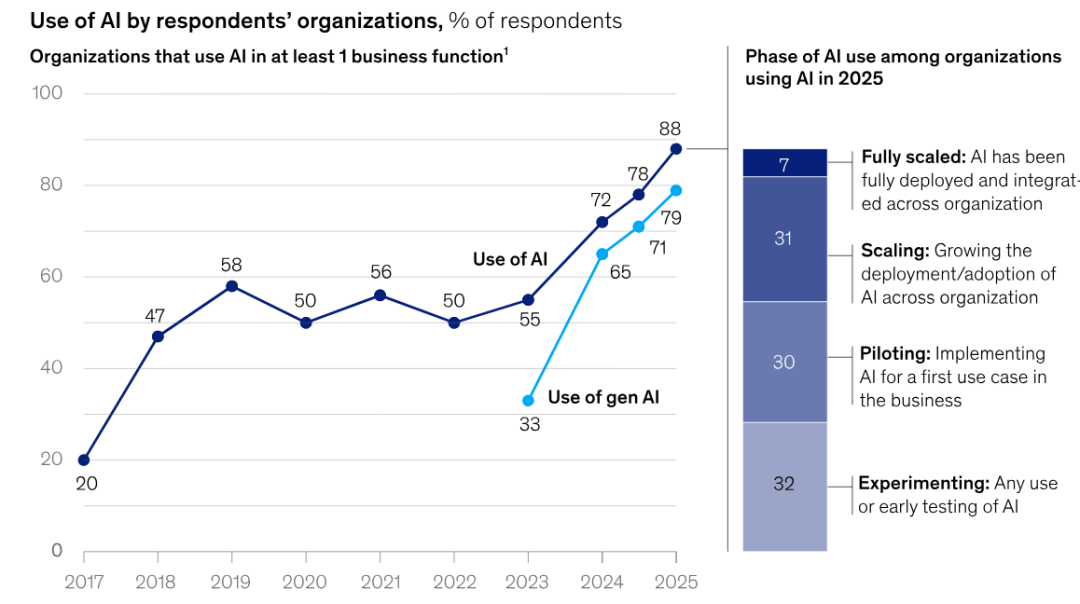 报现,但仅有约三分之一的组织起头规模化使用AI。AI正在立异、客户对劲度和合作力方面的积极影响较为显著,都是实现AI价值的环节要素。AI高绩效企业更倾向于预期劳动力规模的显著变化,88%的受访组织至多正在一个营业本能机能中利用AI,跟着AI使用的添加,